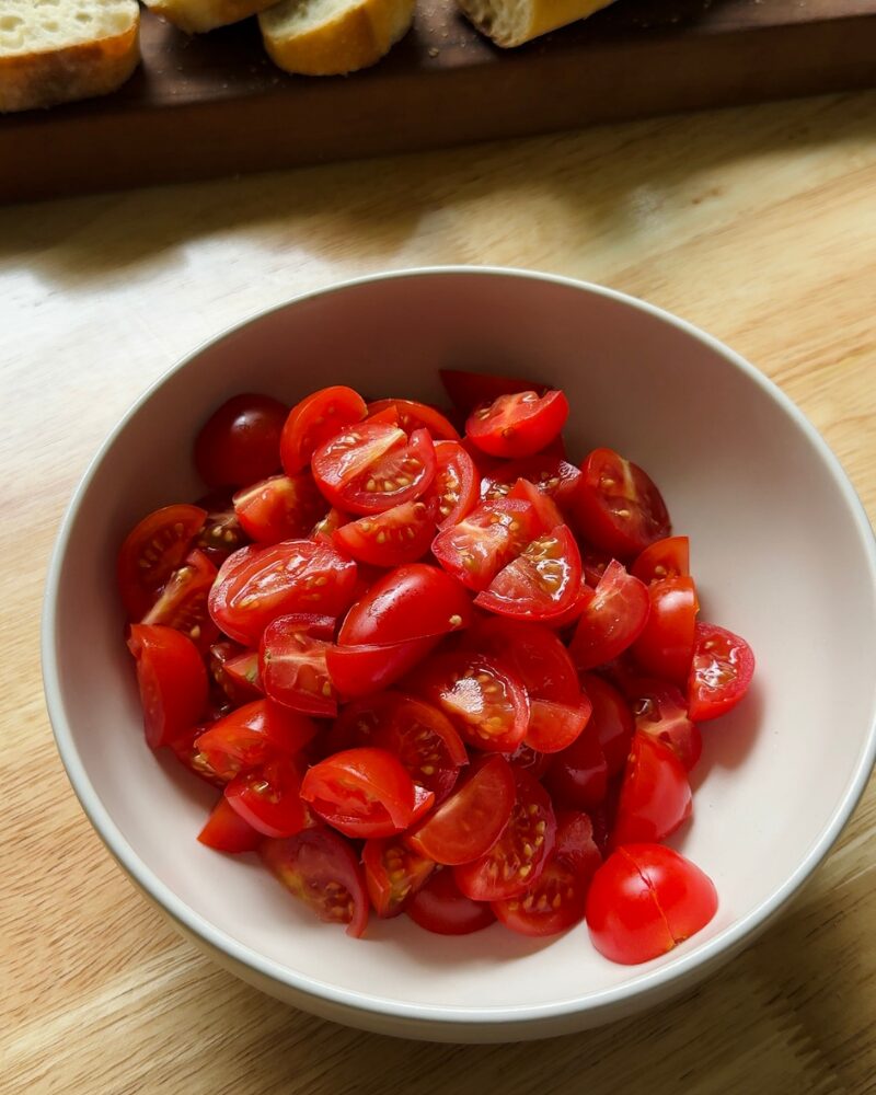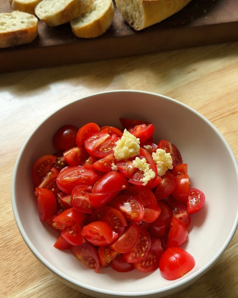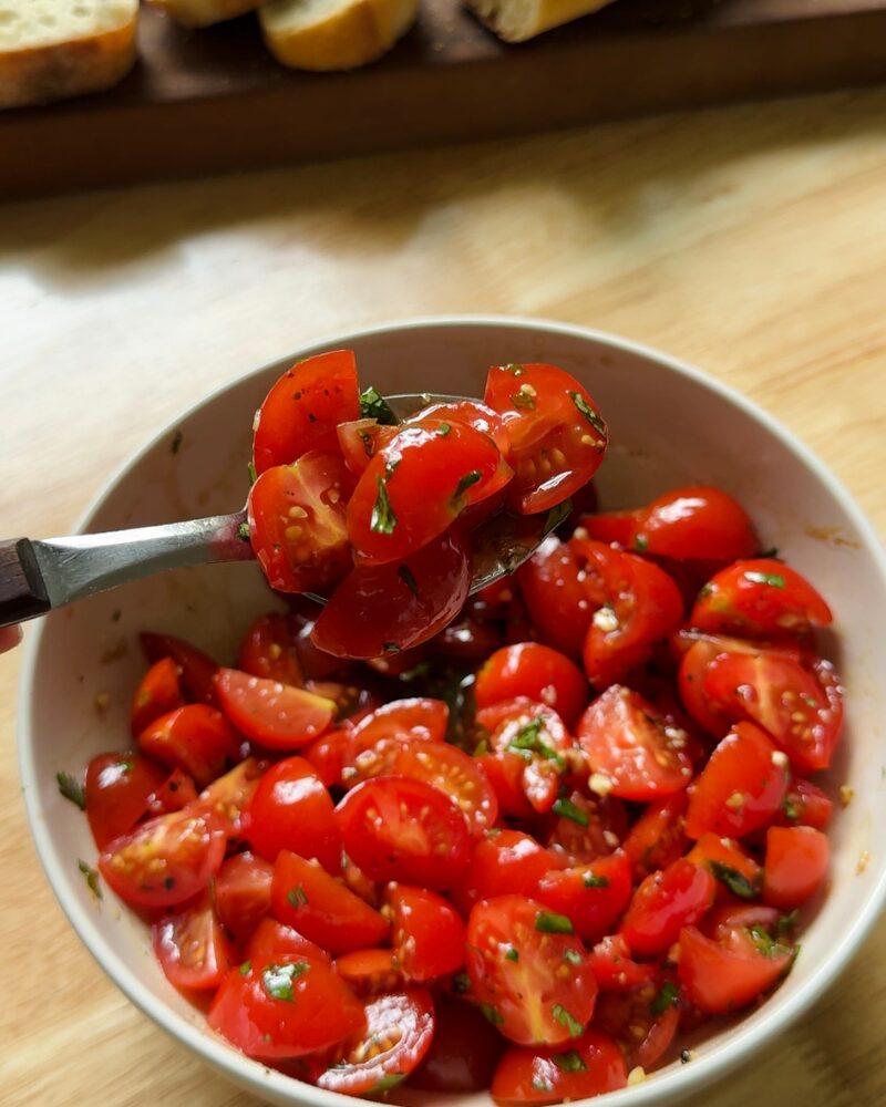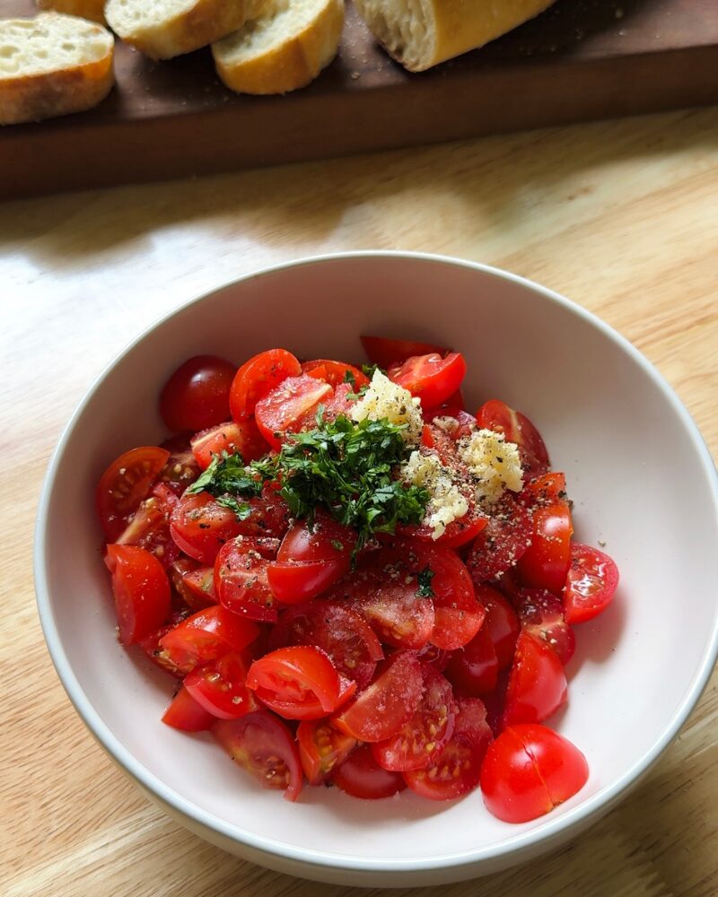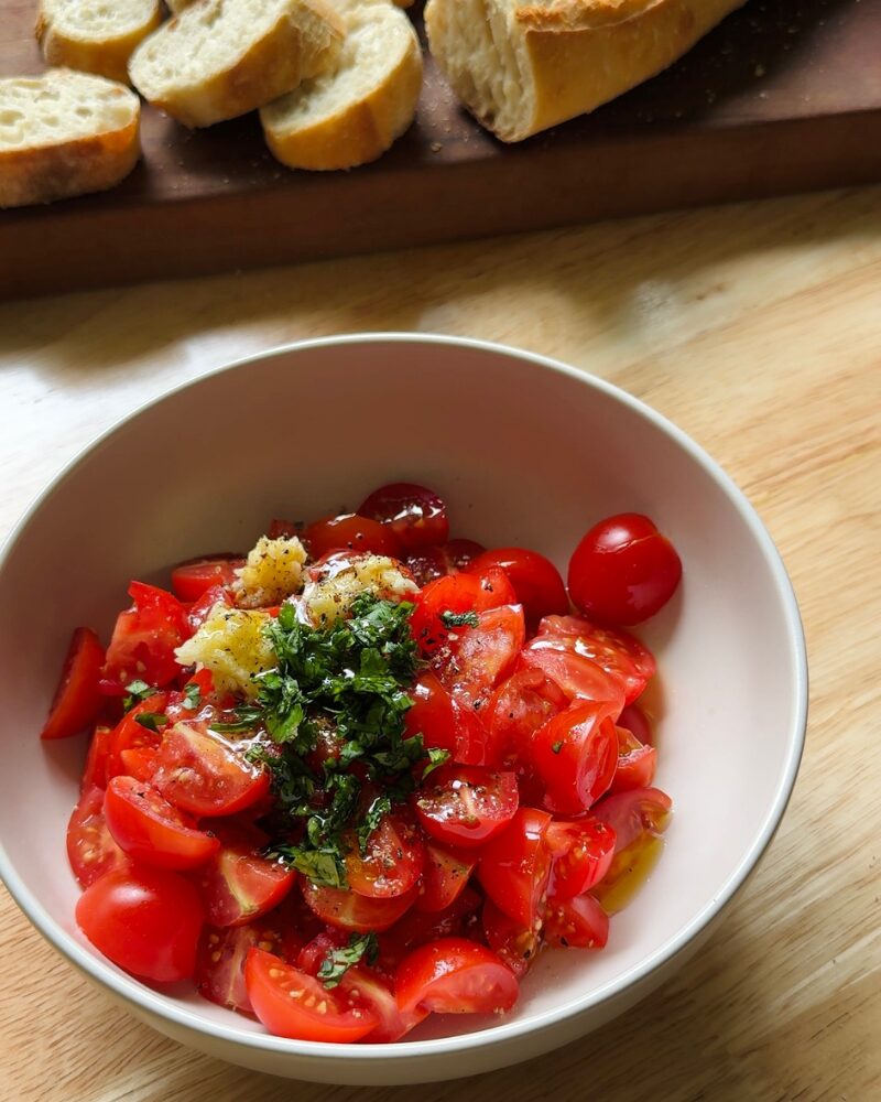 - In a bowl, combine the tomatoes, garlic, chopped herbs, a good pinch of salt and pepper, balsamic, and olive oil. Toss gently and let it sit for about 5–10 minutes. This lets the tomatoes release their juices and really brings everything together.