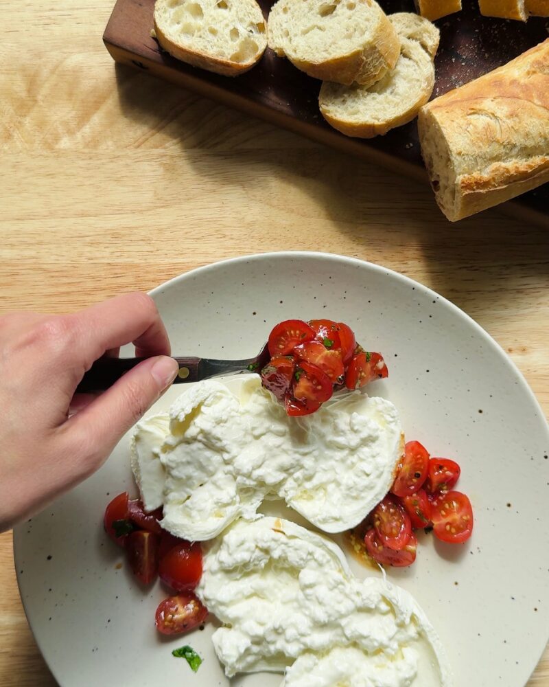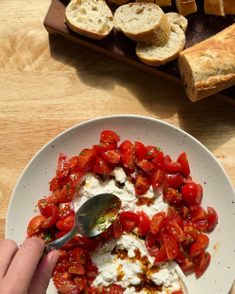 This burrata with marinated tomatoes is one of my favorite appetizers to throw together on short notice—or just because. I especially love making this when I’m in the mood to watch a movie (usually a foodie one—I really need to do a blog post with all my favorites). I’ll make a plate, pour a glass of wine, and it turns into a solo date night situation.