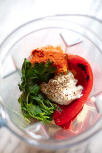 1. In a food processor or blender combine the feta cheese, roasted red peppers, garlic, yogurt, olive oil, lemon juice, paprika, and whatever fresh herbs you’re using.